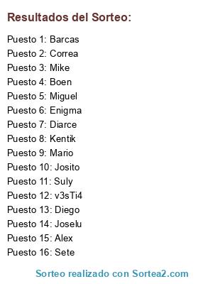 Lista de participantes: Miguel, Barcas, Mario, Diego, Diarce, Alex, v3sTi4, Mike, Joselu, Josito, Kentik, Sete, Correa, Suly, Enigma, Boen.