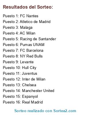 Lista de participantes: FC Nantes, Chelsea, Racing de Santander, FC Barcelona, Real Madrid, Atletico de Madrid, NY Red Bulls, Espanyol, Manchester United, Levante, Malaga, Inter de Milan, Juventus, Hull City, AC Milan, Pumas UNAM.