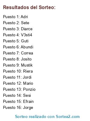 Lista de participantes: Jorge, Adri, Sesi, Mario, Efrain, Riera, Ponzio, Abundi, Correa, Josito, V3sti4, Guti, Sete, Diarce, Jordi, Mustik.