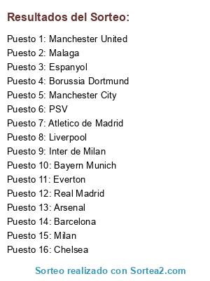 Lista de participantes: Chelsea, Borussia Dortmund, Malaga, Milan, Manchester United, Atletico de Madrid, Espanyol, Liverpool, Everton, Barcelona, Inter de Milan, Bayern Munich, Real Madrid, Arsenal, Manchester City, PSV.