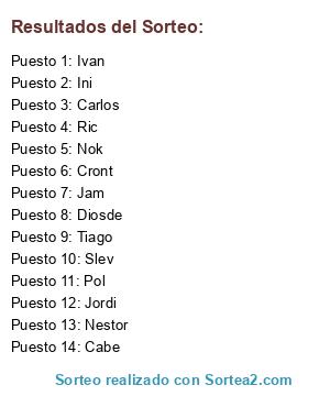 Lista de participantes: Nestor, Pol, Nok, Slev, Cabe, Ric, Ivan, Ini, Cront, Jam, Carlos, Jordi, Tiago, Diosde.