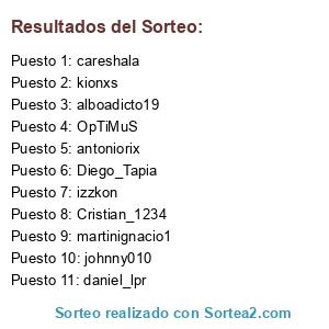 Lista de participantes: alboadicto19, antoniorix, careshala, Cristian_1234, daniel_lpr, Diego_Tapia, izzkon, johnny010, kionxs, martinignacio1, OpTiMuS.