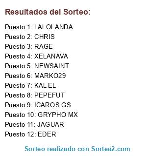 Lista de participantes: GRYPHO MX, NEWSAINT, RAGE, KAL EL, MARKO29, LALOLANDA, CHRIS, JAGUAR, PEPEFUT, XELANAVA, EDER, ICAROS GS.