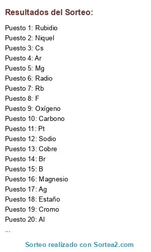 Lista de participantes: H, Hidrógeno, Li, Litio, Na, Sodio, K, Potasio, Fr, Francio, Rb, Rubidio, Cs, Cesio, Be, Berilio, Ra, Radio, Ba, Bario, Mg, Magnesio, Ca, Clacio, Sr, Estroncio, Cr, Cromo, Mn, Manganeso, Fe, Hierro, Co, Cobalto, Ni, Niquel, Cu, Cobre, Zn, Cinc, Cd, Cadmio, Ag, Plata, Au, Oro, Pt, Platino, Pd, Paladio, Hg, Mercurio, B, Boro, Al, Aluminio, C, Carbono, Si, Silicio, Sn, Estaño, Pb, Plomo, N, Nitrógeno, P, Fósforo, As, Arsénico, Sb, Antimonio, O, Oxígeno, S, Azufre, Se, Selenio, Te, Teluro, F, Flúor, Cl, Cloro, Br, Bromo, I, Yodo, He, Helio, Ne, Neón, Xe, Xenón, Kr, Kriptón, Ar, Argón, Rn, Radón, .