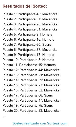 Lista de participantes: Participante 1: Hornets, Participante 2: Hornets, Participante 3: Hornets, Participante 4: Hornets, Participante 5: Hornets, Participante 6: Hornets, Participante 7: Hornets, Participante 8: Hornets, Participante 9: Hornets, Participante 10: Hornets, Participante 11: Hornets, Participante 12: Hornets, Participante 13: Hornets, Participante 14: Hornets, Participante 15: Hornets, Participante 16: Hornets, Participante 17: Hornets, Participante 18: Mavericks, Participante 19: Mavericks, Participante 20: Mavericks, Participante 21: Mavericks, Participante 22: Mavericks, Participante 23: Mavericks, Participante 24: Mavericks, Participante 25: Mavericks, Participante 26: Mavericks, Participante 27: Mavericks, Participante 28: Mavericks, Participante 29: Mavericks, Participante 30: Mavericks, Participante 31: Mavericks, Participante 32: Mavericks, Participante 33: Mavericks, Participante 34: Mavericks, Participante 35: Mavericks, Participante 36: Mavericks, Participante 37: Mavericks, Participante 38: Mavericks, Participante 39: Mavericks, Participante 40: Mavericks, Participante 41: Mavericks, Participante 42: Mavericks, Participante 43: Mavericks, Participante 44: Mavericks, Participante 45: Mavericks, Participante 46: Mavericks, Participante 47: Mavericks, Participante 48: Mavericks, Participante 49: Mavericks, Participante 50: Mavericks, Participante 51: Mavericks, Participante 52: Mavericks, Participante 53: Mavericks, Participante 54: Mavericks, Participante 55: Mavericks, Participante 56: Mavericks, Participante 57: Mavericks, Participante 58: Mavericks, Participante 59: Mavericks, Participante 60: Spurs, Participante 61: Spurs, Participante 62: Spurs, Participante 63: Spurs, Participante 64: Spurs, Participante 65: Spurs, Participante 66: Spurs, Participante 67: Spurs, Participante 68: Spurs, Participante 69: Spurs, Participante 70: Spurs, Participante 71: Spurs, Participante 72: Spurs, Participante 73: Spurs, Participante 74: Spurs, Participante 75: Spurs.