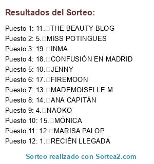 Lista de participantes: 1. SPIKE-HEEL ADDICT, 2. RECIÉN LLEGADA, 3. KRIATURA MALDITA, 4. LICIA AGULLO, 5. NAOKO, 6. MISS POTINGUES, 7. BRANCA DE NEVE, 8. SUPERFICIALES, 9. PATRIZANA, 10. YOLANDA AGUADO, 11. JENNY, 12. THE BEAUTY BLOG, 13. MARISA PALOP, 14. MADEMOISELLE M, 15. ANA CAPITÁN, 16. MÓNICA, 17. CRISTINA PS, 18. FIREMOON, 19. CONFUSIÓN EN MADRID, 20. INMA.