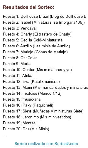 Lista de participantes: Contar (Mis miniaturas y yo), Afrika, Eva (Katalixmainia...), Ly (Mis Minis-Ly), Estefanía (Mis Minis), Rosa (Mis cosas y mis tesoros), Auzilio (Las minis de Auzilio), Marilo, Siete (Muñecas y miniaturas Siete), Carmen, Mayca (Mi lugar secreto), Palaciodemuñecas (Palacio de miniaturas), Carmen (La ventana a mi mundo), Miniros (Miniros), Maribel (Todo Minis), GeMa (Mis Mundos), Contrastes-Rosa Mª (Contrastes Rosa Mª), Mariaje (Cosas de Mariaje), Dru (Mis Minis), Jeronimo (Mis minivestidos), Laura (El mini mundo de Laura), Paky (Paquicheli), Juani (Las minis de Eden), Montse, Rosa-Kreattiva (Kreattiva), Tink-Sonia (MiniTink), El mundo de Padi (El mundo de Padi), Vane (Peketienda), noelia146 (Las minis de Noe y Tony), Latrapallada (Latrapallada), Mali (MaliMin Mis Miniaturas :)), Meapuntoatodo (Las cosas de Meapunto), Aurora (Mini punto y crochet), Maini (Mis manualidades y miniaturas), Charly (El trastero de Charly), Vendaval, Débora (El arca de Noé), Eva-tatalamaru (Minis y más cosas de Eva), Almudena/Almuhada, Ampa (Las minis de Ampa), Pity (Las minis de Pity), Eva (Handmade por Eva Perendreu), music-ana, Jezabel (Jezabel Amigurumis), Antonia (*** mini cositas ***), Marian (MundoMarian), Cecilia Coló-Miniaturista, mcddiss (Mundo 1/12), Rosella (Il salotto delle rose), Teruka (La casita de Teruka), Merche (Mercheminis), Isabel (Miniaturas Isa (morgana135)), La-manitas-2, Terefer (Secretos en el aire), Ciria (Minilusion), Yayin (Mini Yayin), Elena (Mil ideas y algún proyecto), Elis (Minis-onescondlife), Luchipooh, Marta, José Luis y Maria José (miniaturasmjose), Malu2 (Malu's Minis), CrisColas, Pilar Jabon (Mi clase de Villaamil), Yolandaj (Miniaturas), Dollhouse Brazil (Blog do Dollhouse Brazil), El bichillo (Historias de Motril), Ivonne (Miniaturas desde El Elqui)l.