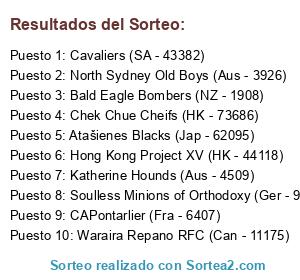 Lista de participantes: Union Rugby Cagliari (Ita - 5637), Arlechinii Bucuresti (Rum - 21858), Pozorrubio Cymru Tyger (Wal - 9762), Kopuarahi (Cook Isl/PI - 1534), Dedard Fookers (Cro - 46139), Leon Club (Spa - 82571), Reaper RFC (Irl - 44328), ILB Hell's Belles (Uru - 77122), Tigres Rugby Club (Arg - 11916), Curne Rugby (Arg - 41011), Cavaliers (SA - 43382), Atašienes Blacks (Jap - 62095), CAPontarlier (Fra - 6407), Katherine Hounds (Aus - 4509), Chek Chue Cheifs (HK - 73686), Hong Kong Project XV (HK - 44118), Soulless Minions of Orthodoxy (Ger - 9813), Dodo (Kenya - 73035), Waraira Repano RFC (Can - 11175), Codigo Malicioso Chilwe XV (Chi - 71734), North Sydney Old Boys (Aus - 3926), Mayo Migrants (Irl - 45341), Dunedain Rangers (USA - 10809), Aldermaston (Eng - 7658), Tongan Horse (Tonga - 61341), Bald Eagle Bombers (NZ - 1908), Little White PartyAnimal (Jap - 63530), ASR Dragon (Fra - 58888), Monte Carlo Martinis (Fra - 72284), Kamchatka XV (Uru - 77191), NW Sables (SA - 43331), Tandil RFC (Arg - 39904), Newport Nippon (Wal - 10173), Dundee Destroyers (Sco - 68041), Dis Mos Mielies (Rus - 80460), Los Tanos Rugby Club (Arg - 12252), Quade Cooper-Dan Carter RFC (HK -73666), Bègles Eagles (Fra - 59368), House Keeping (Geo - 70277), Sarc XV (Fra - 57378).