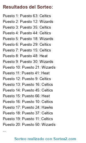 Lista de participantes: Puesto 1: Celtics, Puesto 2: Celtics, Puesto 3: Celtics, Puesto 4: Celtics, Puesto 5: Celtics, Puesto 6: Celtics, Puesto 7: Wizards, Puesto 8: Celtics, Puesto 9: Celtics, Puesto 10: Celtics, Puesto 11: Celtics, Puesto 12: Wizards, Puesto 13: Celtics, Puesto 14: Hawks, Puesto 15: Celtics, Puesto 16: Celtics, Puesto 17: Celtics, Puesto 18: Wizards, Puesto 19: Heat, Puesto 20: Wizards, Puesto 21: Wizards, Puesto 22: Celtics, Puesto 23: Wizards, Puesto 24: Hawks, Puesto 25: Celtics, Puesto 26: Celtics, Puesto 27: Celtics, Puesto 28: Wizards, Puesto 29: Celtics, Puesto 30: Wizards, Puesto 31: Celtics, Puesto 32: Heat, Puesto 33: Hawks, Puesto 34: Hawks, Puesto 35: Celtics, Puesto 36: Wizards, Puesto 37: Celtics, Puesto 38: Celtics, Puesto 39: Celtics, Puesto 40: Celtics, Puesto 41: Heat, Puesto 42: Celtics, Puesto 43: Celtics, Puesto 44: Celtics, Puesto 45: Celtics, Puesto 46: Hawks, Puesto 47: Hawks, Puesto 48: Heat, Puesto 49: Hawks, Puesto 50: Wizards, Puesto 51: Wizards, Puesto 52: Celtics, Puesto 53: Celtics, Puesto 54: Heat, Puesto 55: Celtics, Puesto 56: Wizards, Puesto 57: Wizards, Puesto 58: Heat, Puesto 59: Celtics, Puesto 60: Celtics, Puesto 61: Celtics, Puesto 62: Wizards, Puesto 63: Celtics, Puesto 64: Celtics, Puesto 65: Heat, Puesto 66: Heat, Puesto 67: Hawks, Puesto 68: Hawks, Puesto 69: Celtics, Puesto 70: Celtics, Puesto 71: Heat, Puesto 72: Wizards, Puesto 73: Celtics, Puesto 74: Celtics.