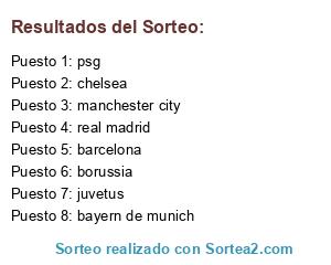 Lista de participantes: borussia, psg, real madrid, barcelona, bayern de munich, manchester city, chelsea, juvetus.