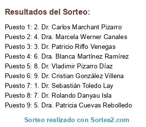 Lista de participantes: 1. Dr. Sebastián Toledo Lay, 2. Dr. Carlos Marchant Pizarro, 3. Dr. Patricio Riffo Venegas, 4. Dra. Marcela Werner Canales, 5. Dra. Patricia Cuevas Rebolledo, 6. Dra. Blanca Martínez Ramírez, 7. Dr. Rolando Danyau Isla, 8. Dr. Vladimir Pizarro Díaz, 9. Dr. Cristian González Villena.