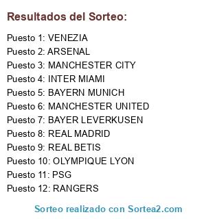 Lista de participantes: MANCHESTER CITY, MANCHESTER UNITED, ARSENAL, BAYERN MUNICH, BAYER LEVERKUSEN, OLYMPIQUE LYON, PSG, REAL MADRID, REAL BETIS, INTER MIAMI, RANGERS, VENEZIA.