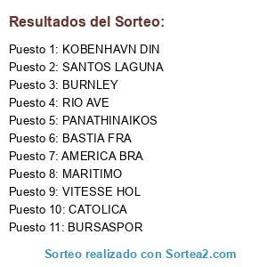 Lista de participantes: DARMSTADT ALE, FC INGOLSTADT ALE, LEIPZIG ALE, FRIBURGO ALE, AL AHLI ARA, ESTUDIANTE L.P, INDEPENDIENTE, LANUS, RACING, RIVER, CENTRAL, KAA GENT BEL, KRC GENK BEL, KV OOSTENDE BEL, ANDERLECHT BEL, STANDARD LIEJA BEL, ZULTE BEL, AMERICA BRA, PARANAENSE, BOTAFOGO, FLUMINENSE, GREMIO, INTER BRA, PALMEIRAS, U DE CHILE, CATOLICA, COLO COLO, INDEP SANTA FE, ATL. NACIONAL, INDEP MEDELLIN, KOBENHAVN DIN, CELTIC, SPORTING GIJON, GRANADA, OSASUNA, ANGERS FRA, NANCY FRA, DIJON FRA, GUIGAMP FRA, LORIENT FRA, METZ FRA, NANTES FRA, MONTPELLIER, BASTIA FRA, CAEN FRA, TOULOUSE, AZ HOL, UTRECH HOL, HEERENVEEN, VITESSE HOL, BOURNE ING, BURNLEY, CAGLIAZZO, CROTONE, EMPOLI, PALERMO, PESCARA, AMERICA, GAUDALAJARA, LEON, MORELIA, MONTERREY, PACHUCA, SANTOS LAGUNA, TIGRES, TOLUCA, UNAM, VERACRUZ, BELENENSES, BOAVISTA, NACIONAL POR, MARITIMO, MOREIRENSE, RIO AVE, VICTORIA POR, PANATHINAIKOS, PAOK, ANZ RUSIA, ROSTOV RUS, TEREK RUSIA, BSC SUIZA, AKHISARSPOR, ANTALYASPOR, BURSASPOR, GENCLERBIRLIGI, KONYASPOR, BASAKSEHIR, TRABZONSPOR, OSMANLISPOR.