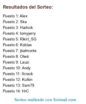 Lista de participantes: Rikirt_SG, tomyjerry, Harlock, Ilcrack, Sam79, HrC, jbalmonte, Kulkin, Andy, Koblas, Lauzi, Ska, Olwë, Alex.