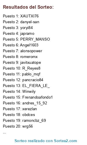 Lista de participantes: PERRY_MANSO, xerezlan, elsergi77, danyel-san, joparna, R_Reyes8, eljuanlu, wrg56, javitxuatope, Frenandoafondo1, Armand_Freak, yoryi84, andres_15_92, maosh, Mianardi, alonsopower, Winwily, EL_FIERA_LE_, Fasterman76, japramo, romeromx, ramoncbz_69, guanaticontomati, pancracio84, danumol, pablo_mqf, fcougar, XAUTXI76, Sergiogp90, obdces, Angel1603, davidiho10.
