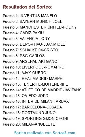 Lista de participantes: MANCHESTER UNITED-POLINY, ATLETICO DE MADRID-JAVIFANS, INTER DE MILAN-FARBAX, BARCELONA-LOSADA, SPORTING GIJON-CHONI, AJAX-QUERO, ARSENAL-AKTGANO, SCHALKE 04-CRISTO, LIVERPOOL-ROMAPRO, VALENCIA-JONY, JUVENTUS-MANELO, DEPORTIVO-JUANMIOLE, REAL MADRID-MARPE, TENERIFE-MOITENERIFE, MILAN-ANGELETE, OVIEDO-JORDI, PSG-CARLOS, DORTMUND-JUNO, BAYERN MUNICH-JOEL, CADIZ-PAKIU.