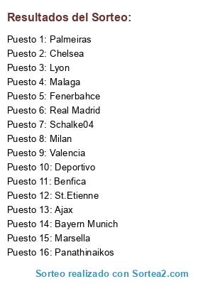 Lista de participantes: Schalke04, Bayern Munich, Chelsea, Milan, Benfica, Lyon, Real Madrid, Valencia, Deportivo, Panathinaikos, Ajax, Malaga, Marsella, St.Etienne, Fenerbahce, Palmeiras.