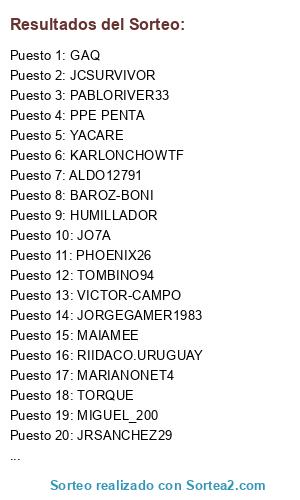 Lista de participantes: EMAELMATE, KARLONCHOWTF, LENNIN_BAR, JUANKSTIGMA, MARIANONET4, TORQUE, MAUROMAN, HUMILLADOR, KAKAROTO, JCSURVIVOR, NICO_4, RINZILER, LEOCARP1310, JRSANCHEZ29, BAROZ-BONI, PABLORIVER33, PPE PENTA, VICTOR-CAMPO, TOMBINO94, GAQ, JHOJAGACA, MIGUEL_200, ANDRESMORON, SIKARIORCENTRAL, RIIDACO.URUGUAY, KURILIN, PHOENIX26, ALDO12791, JO7A, YACARE, MAIAMEE, JORGEGAMER1983.