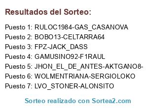 Lista de participantes: WOLMENTRIANA-CELTARRA64, F1RAUL-GAMUSINO92, JACK_DASS-ALONSITO, AKTGANO8-JHON_EL_DE_ANTES, BOBO13-LVO_STONER, FPZ-SERGIOLOKO, GAS_CASANOVA-RULOC1984.