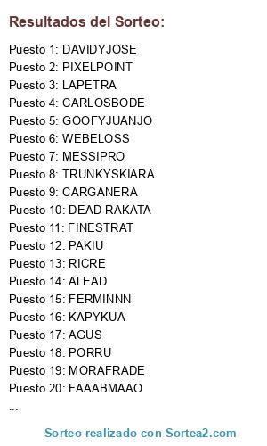 Lista de participantes: AGUS, ALEAD, CARGANERA, CARLOSBODE, DAVIDYJOSE, DEAD RAKATA, FAAABMAAO, FERMINNN, FINESTRAT, GOOFYJUANJO, ICAROPUB, JAIME, KAPYKUA, LAPETRA, LINHO, MARTINCACERES, MESSIPRO, MIKELO, MORAFRADE, PAKIU, PIXELPOINT, PORRU, RICRE, RIKEL, TRUNKYSKIARA, WEBELOSS, XEMITA.