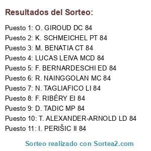 Lista de participantes: K. SCHMEICHEL PT 84, N. TAGLIAFICO LI 84, T. ALEXANDER-ARNOLD LD 84, M. BENATIA CT 84, LUCAS LEIVA MCD 84, R. NAINGGOLAN MC 84, D. TADIC MP 84, I. PERIŠIC II 84, F. BERNARDESCHI ED 84, F. RIBÉRY EI 84, O. GIROUD DC 84.