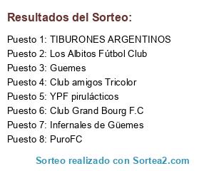 Lista de participantes: Guemes, TIBURONES ARGENTINOS, Los Albitos Fútbol Club, Club Grand Bourg F.C, YPF pirulácticos, Infernales de Güemes, Club amigos Tricolor, PuroFC.