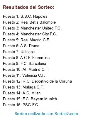 Lista de participantes: Real Madrid C.F., S.S.C. Napoles, F.C. Bayern Munich, Udinese, A.S. Roma, Valencia C.F., Manchester United F.C., R.C. Deportivo de la Coruña, Real Betis Balompie, A.C.F. Fiorentina, At. Madrid C.F., Manchester City F.C., Malaga C.F., A.C. Milan, F.C. Barcelona, PSG F.C..