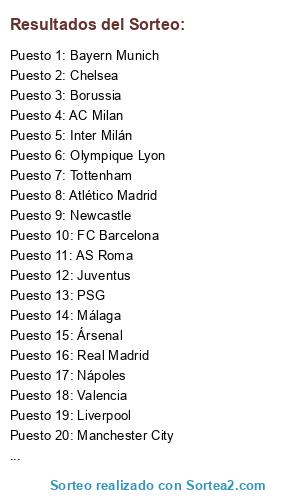 Lista de participantes: Real Madrid, FC Barcelona, Manchester Utd, Manchester City, Chelsea, Inter Milán, AC Milan, Bayern Munich, PSG, Ársenal, Liverpool, Atlético Madrid, Tottenham, Zenit, Olympique Lyon, Juventus, Valencia, AS Roma, Borussia, Nápoles, Málaga, Newcastle.