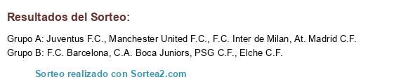 Lista de participantes: F.C. Barcelona, At. Madrid C.F., C.A. Boca Juniors, PSG C.F., F.C. Inter de Milan, Elche C.F., Juventus F.C., Manchester United F.C..