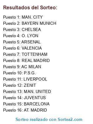 Lista de participantes: AC MILAN, ARSENAL, AT. MADRID, BARCELONA, BAYERN MUNICH, CHELSEA, JUVENTUS, LIVERPOOL, MAN. CITY, MAN. UNITED, O. LYON, P.S.G., REAL MADRID, VALENCIA, TOTTENHAM, ZENIT.