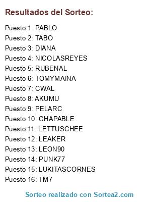 Lista de participantes: PELARC, AKUMU, NICOLASREYES, TOMYMAINA, PABLO, TABO, DIANA, LEAKER, TM7, LEON90, RUBENAL, CHAPABLE, LETTUSCHEE, PUNK77, CWAL, LUKITASCORNES.