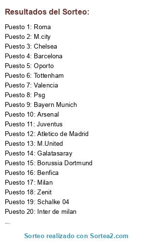 Lista de participantes: Napoles, Psg, M.city, Tottenham, Chelsea, Real Madrid, Milan, Borussia Dortmund, Schalke 04, Roma, Valencia, Zenit, Monaco, Bayern Munich, Atletico de Madrid, Barcelona, Benfica, Galatasaray, Oporto, Inter de milan, Juventus, M.United, Arsenal, Liverpool.