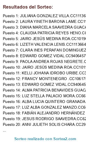 Lista de participantes: ERICA TINOCO GAVIRIA.CC29686993, EDWARD GOMEZ VIDAL.CC94064577, CINDY DAYANA LOPEZ PENCUE.CC1061701082, ADRIANA BELALCAZAR ORTIZ.CC29675916, BRIAN ALEXIS LAVERDE.CC1114882263, OLGA PATRICIA.CC25120136, ALMA PATRICIA BENAVIDES GUACALES.CC59827036, KELLI JOHANA IDROBO URIBE.CC34324042, GLORIA ESTELLA GIL RIVERA.CC31176706, DIANA MARIA ANGEL URREA.CC52835858, LAURA YINETH BARONA LAME.CC1144070451, RODRIGO JOSÉ TRIVIÑO LOAIZA .CC94329856, CLAUDIA PATRICIA REYES HENAO.CC29687390, ANGELICA MARIA DIAZ ANGEL.CC29661670, ELIA LIZETH DIAZ HINCAPIE.CC1113661046, ELIZABETH ZUÑIGA HINESTROSA.CC1113627175, ANNI JULIETH SOLIS CHARA.CC29507513, LUZ ESTELIA JIMENEZ MONTENEGRO.CC29658153, CLARA INÉS PERAFÁN DOMÍNGUEZ.CC31171907, SIRLENY VALENCIA.CC66765103, CRHISTIAN ALBERTO MUÑOZ PERDOMO.CC6383981, NIYIRETH CANO VALENCIA.CC1113676733, YULIETH VANESSA CALERO IBARRA.CC1061735648, JAIRO JESÚS MEDINA ROA.CC1019095238, DIELA DEL CARMEN CALAMBAS MELO.CC66773934, LUZ ALBA GONZALEZ MANZO.CC66772079, MARGARITA MARÍA VALENCIA GUZMAN.CC29434530, ALBA LUCIA QUINTERO GRANADA.CC30291451, LUZ ELENA PEREZ TRUJILLO.CC66772112, BRIAN ALEXIS LAVERDE.CC1114882263, KELLI JOHANA IDROBO URIBE.CC34324042, LAURA YINETH BARONA LAME.CC1144070451, AYDA RUBY LÓPEZ ACOSTA.CC29662984, DIANA FERNANDA PARRA ROJAS.CC29672925, ANGELICA MARIA DIAZ ANGEL.CC29661670, NIYIRETH CANO VALENCIA.CC1113676733, ELIZABETH ZÚÑIGA HINESTROSA.CC1113627175, ELIA LIZETH DIAZ HINCAPIE.CC1113661046, CLAUDIA PATRICIA REYES HENAO.CC29687390, JOHANNA PATRICIA LEÓN SERNA.CC29689138, CINDY DAYANA LOPEZ.CC1061701082, DIANA MARIA ANGEL URREA.CC52835858, MARGARITA MARÍA VALENCIA GUZMÁN .CC29434530, ALMA PATRICIA BENAVIDES GUACALES.CC59827036, RODRIGO JOSÉ TRIVIÑO LOAIZA .CC94329856, ANDRES GIOVANNY GUZMAN RIVERA.CC6393731, EDWARD GOMEZ VIDAL.CC94064577, LUIS DAVID ALZATE ZAMBRANO.CC1112224535, YULIETH VANESSA CALERO IBARRA.CC1061735648, SEBASTIÁN ESCOBAR BOLAÑOS.CC1144143500, LUIS DAVID ALZATE ZAMBRANO.CC1112224535, JESÚS RODRIGO SAAVEDRA GONZALEZ .CC6292105, CLARA INES PERAFAN DOMINGUEZ.CC31171907, FABIÁN ALEJANDRO HERNÁNDEZ CALVO.CC1070922781, JAIRO JESÚS MEDINA ROA.CC1019095238, JULIANA GONZALEZ VILLA.CC1113634078, LUZ STELLA PALACIO MORA.CC66770347, LUZ STELLA PALACIO MORA.CC66770347, OLGA PATRICIA SICACHA RUIZ.CC25120136, ANNI JULIETH SOLIS CHARA.CC29507513, DIANA MARCELA SAAVEDRA GUACA.CC1061798040, SIRLENY VALENCIA .CC66765103, BRIAN ALEXIS LAVERDE OSSA.CC1114882263, ALBA LUCIA QUINTERO GRANADA.CC30291451, ERICA TINOCO GAVIRIA .CC29686993, DIANA FERNANDA PARRA ROJAS .CC29672925, ANA CILIA LEYTON MARTINEZ.CC29703737, CLARA INES PERAFAN DOMINGUEZ.CC31171907, AYDA RUBY LÓPEZ ACOSTA.CC29662984, MARIA ZULAY MEJIA TORRES.CC66771066, MAIRA ALEJANDRA MAZUERA.CC1113624594, DIANA MARIA ANGEL URREA.CC52835858, EDWARD GOMEZ VIDAL.CC94064577, OLGA PATRICIA SICACHA RUIZ.CC25120136, KELLI JOHANA IDROBO URIBE.CC34324042, LEONARDO BERNAL ROMERO.CC80186979, PAOLA ANDREA ROJAS NEGRETE.CC1113652163, LUZ ADRIANA SÁNCHEZ POLO.CC66767005, CLAUDIA PATRICIA REYES HENO.CC29687390, DIANA MARCELA SAAVEDRA GUACA.CC1061798040, MARIA DEL PILAR CASTAÑO VALENCIA.CC31166380, LIZETH VALENCIA LENIS.CC1113664213, JESÚS ANTONIO MARTÍNEZ CORREA.CC94312123, YULIETH VANESSA CALERO IBARRA .CC1061735648, ALMA PATRICIA BENAVIDES GUACALES.CC59827036, JENNY AYALA BRAND.CC29675677, ANGELICA MARIA DIAZ ANGEL.CC29661670, ELIZABETH ZUÑIGA HINESTROSA.CC1113627175, JAIRO JESÚS MEDINA ROA.CC1019095238, MARIA XIOMARA MOSQUERA NOVA.CC1144170218, LUIS DAVID ALZATE ZAMBRANO.CC1112224535, FABIAN ALEJANDRO HERNÁNDEZ CALVO.CC1070922781, FRANCY MONTENEGRO .CC1061750252, FRANCY MONTENEGRO.CC1061750252, LADY KAREN OMEN GARCIA.CC1113674716, ILSE MUÑOZ FERNANDEZ.CC31168703, LADY KAREN OMEN GARCIA.CC1113674716, DIANA SERRANO .CC1113642918, NIYIRETH CANO.CC1113676733, SEBASTIÁN ESCOBAR BOLAÑOS.CC1144143500, ANDRES GIOVANNY GUZMAN RIVERA.CC6393731, STEFANY VELASCO DURAN.CC1113673052, LUZ STELLA PALACIO MORA.CC66770347, RODRIGO JOSÉ TRIVIÑO LOAIZA .CC94329856, OLGA PATRICIA SICACHA RUIZ.CC25120136, BRIAN ALEXIS LAVERDE OSSA.CC1114882263, DIANA FERNANDA PARRA ROJAS.CC29672925, ILSE MUÑOZ FERNANDEZ.CC31168703, ANGELICA MARIA DIAZ ANGEL.CC29661670, ALBA LUCIA QUINTERO GRANADA.CC30291451, AYDA RUBY LÓPEZ ACOSTA.CC29662984, CLARA INES PERAFAN DOMINGUEZ.CC31171907, LUIS DAVID ALZATE ZAMBRANO.CC1112224535, DIANA MARÍA ANGEL URREA.CC52835858, DANIEL ARCE.CC1113640583, MARIA XIOMARA MOSQUERA NOVA.CC1144170218, EDWARD GOMEZ VIDAL.CC94064577, PAOLA ANDREA ROJAS NEGRETE.CC1113652163, JAIRO JESÚS MEDINA ROA.CC1019095238, KELLI JOHANA IDROBO URIBE.CC34324042, LIZETH VALENCIA LENIS.CC1113664213, NIYIRETH CANO VALENCIA.CC1113676733, RODRIGO JOSÉ TRIVIÑO LOAIZA.CC94329856, ALMA PATRICIA BENAVIDES GUACALES.CC59827036, CINDY DAYANA LOPEZ.CC1061701082, DIANA MARCELA SAAVEDRA GUACA.CC1061798040, YAMILETH CARVJAL.CC29505214, MAIRA ALEJANDRA MAZUERA.CC1113624594, LADY KAREN OMEN GARCIA.CC1113674716, CLAUDIA PATRICIA REYES HENAO.CC29687390, CAROLINA BERMUDEZ DIAGO.CC1113670948, JENNY AYALA BRAND.CC29675677, MAURICIO VERGARA VINASCO.CC1144075037, DIEGO FERNANDO VASQUEZ ASTUDILLO.CC16278573, ERICA TINOCO GAVIRIA .CC29686993, CRHISTIAN ALBERTO MUÑOZ PERDOMO.CC6383981, FRANCY MONTENEGRO.CC1061750252, LAURA YINETH BARONA LAME.CC1144070451, MARGARITA MARÍA VALENCIA GUZMÁN .CC29434530, EDWIN MANUEL REYES BARRETO.CC8834793, ANNI JULIETH SOLIS CHARA.CC29507513, ELIZABETH ZÚÑIGA HINESTROSA.CC1113627175, MARIA ALEJANDRA LERMA .CC1113653105, JESUS RODRIGO SAAVEDRA.CC6292105, SIRLENY VALENCIA.CC66765103, ANTONIO MARTINEZ.CC94312123, GIOVANY GUZMAN RIVERA.CC6393731, LUZ PALACIO.CC66770347, RAMON ALFONSO CALVO.CC16261811, ANDRES ANAYA.CC1061746312.