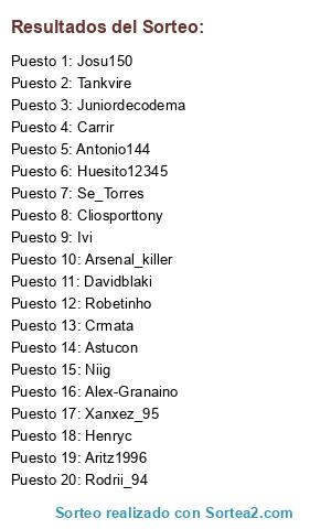 Lista de participantes: Alex-Granaino, Rodrii_94, Huesito12345, Aritz1996, Ivi, Niig, Robetinho, Crmata, Juniordecodema, Josu150, Antonio144, Davidblaki, Tankvire, Se_Torres, Cliosporttony, Xanxez_95, Henryc, Astucon, Carrir, Arsenal_killer.