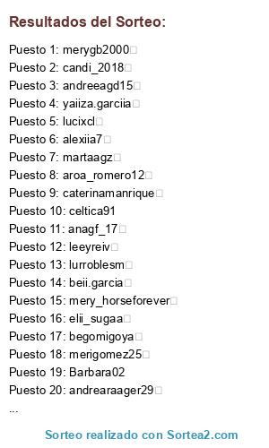 Lista de participantes: mery_horseforever (32), anagf_17 (51), marinapmtj, _raquelgb (5), borja__05 (5), yaiiza.garciia (68), crislo.4, guille_martinez17, alexiia7 (42), romero_n_, martaagz (61), amayaaalopez (3), andreagdb9 (2), pollovolador13 (2), aroa_romero12 (16), arual_pmtl, lu_infante_ (5), barbara020_ee (17), lucixcl (70), candi_2018 (21), lurroblesm (25), caterinamanrique (20), _mariiiatj, paau.benito, pfotos.2017, elii_sugaa (8), andrearaager29 (5), nataliavasa (2), martaml97_, luciiaa_db22 (2), itsmaria02_ (2), beii.garcia (20), celtica91, claudiafital, _gh_lucas_ (25), merygb2000 (16), maria_decoca, alexandra99_sg (2), patriciapano_02 (3), merigomez25 (10), begomigoya (2), carlos_sanchezdeo, sariiiiih_ (6), cris_de_torres (10), daviid_cuesta (6), vero_ye94 (6), mikelpg8 (7), santiagoyunta, _aandre25_, sofiaa_quintana (2), eneko.yarza (5), leeyreiv (39), horserider.sara (8), blaanca.seg (3), _iiria_ (8), menciaaa.608 (14), aiiriin_4, srta.zeta, irene.paal, pukii_, nereita05rr, valentin_011 (4), eqirene, juegosdecaballos_horses, ruth_munozz, isa_saiz, deienearroyo14 (16), nerea_ugao, lakasty_conk10 (9), galapa_9_8, oskar_freestyle, betty_fdz_ (19), andreeagd15 (43), laiaferrer12 (5), carlotaa.05, Barbara02 (34), aliziass (18), nataprieto09 (3).