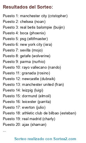 Lista de participantes: manchester united (fran), parma (nurhio), ajax (shaman), psg (eltifmaster), las palmas (rudyset), athletic club de bilbao (esteban), liverpool (meram), vissel kobe (david), rayo vallecano (nando), real oviedo (vene), osasuna (urko), fc barcelona (pazziemar), real betis balompie (buijin), atletico san luis de mexico (albervil), lazio (macek), dormund (elmoil), granada (rosino), everton (julio), chelsea (noan), real madrid (charly), new york city (isra), arsenal (clanis), sevilla (mojo), manchester city (cristopher), leizpig (luigi), espanyol (xtian), newcastle (dubraik), boca (phoenix), leicester (parrita), mallorca (dechors), valencia (racuma), getafe (wolverine).