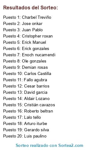 Lista de participantes: Demian rosas, Cristopher roxan, Jose onkar, Roberto beltran, Luis paulino, David garcia, Lalo tello, Gerardo silva, Erick Manuel, Cristián cavazos, Fallo agubra, Carlos Castilla, Erick gonzales, Arturo iturbe, Aldair Lozano, Charbel Treviño, Enoch nucamendi, Juan Pablo, Ole gonzales, Cesar barrios.