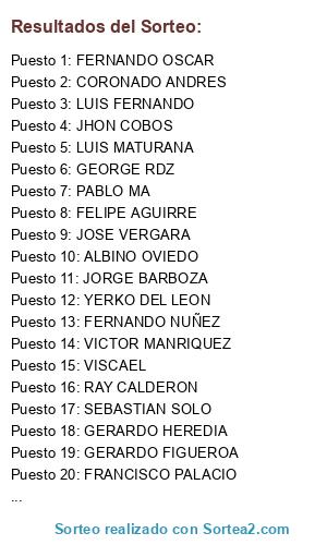 Lista de participantes: MIGUEL CALVILLO, ALBINO OVIEDO, DIEGO ROSALES, FERNANDO OSCAR, MARIO MUÑOZ, GERARDO FIGUEROA, LUIS MATURANA, LUIS FERNANDO, SEBASTIAN SOLO, VISCAEL, JOSE VERGARA, FROYLAN JIMENEZ, JORGE BARBOZA, CORONADO ANDRES, RAY CALDERON, GEORGE RDZ, FERNANDO NUÑEZ, HOMERO TALAMANTES, FELIPE AGUIRRE, MIKHELE GRIMALDOS, LUIS HERNANDEZ, JUAKO ASI TAL CUAL, FEDERICO NUÑEZ, YERKO DEL LEON, VICTOR MANRIQUEZ, OSCAR GONZALES, JOSAFAR VELEZ, GERARDO HEREDIA, FRANCISCO PALACIO, JHON COBOS, PABLO MA.