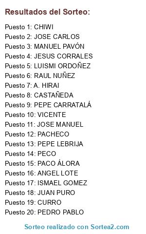 Lista de participantes: CHIWI, JOSE CARLOS, MANUEL PAVÓN, PEDRO PABLO, CURRO, VICENTE, RAUL NUÑEZ, JESUS CORRALES, PACO ÁLORA, PEPE LEBRIJA, JOSE MANUEL, PACHECO, LUISMI ORDOÑEZ, JUAN PURO, PEPE CARRATALÁ, CASTAÑEDA, ISMAEL GOMEZ, PECO, ANGEL LOTE, A. HIRAI.