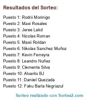 Lista de participantes: Daniiel Quezada, Kevin Ferreyra, Nikolas Sanchez Muñoz, Maxi Rosales, Jeree Lakd, Nicolas Roman, Alvarito BJ, Leandro Nuñez, Maxii Roldan, Rodrii Morinigo, Clemente Silva, Faku Barla Negriazul.