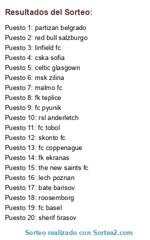 Lista de participantes: roosemborg, the new saints fc, skonto fc, linfield fc, cska sofia, fk teplice, fc pyunik, partizan belgrado, bate barisov, lech poznan, fk ekranas, msk zilina, sherif tirasov, celtic glasgown, fc tobol, malmo fc, red bull salzburgo, fc basel, rsl anderletch, fc coppenague.