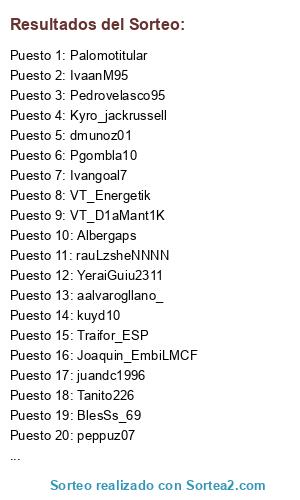 Lista de participantes: VT_Energetik, peppuz07, Traifor_ESP, Blesita69, YeraiGuiu2311, rauLzsheNNNN, sersol96, Tanito226, Kyro_jackrussell, Joaquin_EmbiLMCF, BlesSs_69, Alvaritocor13, kuyd10, Albergaps, Pgombla10, Ivangoal7, aalvarogllano_, Pedrovelasco95, Ghost_Z1sr4C, Palomotitular, dmunoz01, juandc1996, VT_D1aMant1K, IvaanM95.