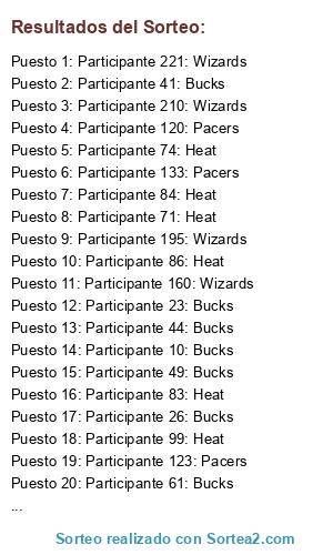Lista de participantes: Participante 1: Bucks, Participante 2: Bucks, Participante 3: Bucks, Participante 4: Bucks, Participante 5: Bucks, Participante 6: Bucks, Participante 7: Bucks, Participante 8: Bucks, Participante 9: Bucks, Participante 10: Bucks, Participante 11: Bucks, Participante 12: Bucks, Participante 13: Bucks, Participante 14: Bucks, Participante 15: Bucks, Participante 16: Bucks, Participante 17: Bucks, Participante 18: Bucks, Participante 19: Bucks, Participante 20: Bucks, Participante 21: Bucks, Participante 22: Bucks, Participante 23: Bucks, Participante 24: Bucks, Participante 25: Bucks, Participante 26: Bucks, Participante 27: Bucks, Participante 28: Bucks, Participante 29: Bucks, Participante 30: Bucks, Participante 31: Bucks, Participante 32: Bucks, Participante 33: Bucks, Participante 34: Bucks, Participante 35: Bucks, Participante 36: Bucks, Participante 37: Bucks, Participante 38: Bucks, Participante 39: Bucks, Participante 40: Bucks, Participante 41: Bucks, Participante 42: Bucks, Participante 43: Bucks, Participante 44: Bucks, Participante 45: Bucks, Participante 46: Bucks, Participante 47: Bucks, Participante 48: Bucks, Participante 49: Bucks, Participante 50: Bucks, Participante 51: Bucks, Participante 52: Bucks, Participante 53: Bucks, Participante 54: Bucks, Participante 55: Bucks, Participante 56: Bucks, Participante 57: Bucks, Participante 58: Bucks, Participante 59: Bucks, Participante 60: Bucks, Participante 61: Bucks, Participante 62: Bucks, Participante 63: Bucks, Participante 64: Bucks, Participante 65: Bucks, Participante 66: Bucks, Participante 67: Bucks, Participante 68: Heat, Participante 69: Heat, Participante 70: Heat, Participante 71: Heat, Participante 72: Heat, Participante 73: Heat, Participante 74: Heat, Participante 75: Heat, Participante 76: Heat, Participante 77: Heat, Participante 78: Heat, Participante 79: Heat, Participante 80: Heat, Participante 81: Heat, Participante 82: Heat, Participante 83: Heat, Participante 84: Heat, Participante 85: Heat, Participante 86: Heat, Participante 87: Heat, Participante 88: Heat, Participante 89: Heat, Participante 90: Heat, Participante 91: Heat, Participante 92: Heat, Participante 93: Heat, Participante 94: Heat, Participante 95: Heat, Participante 96: Heat, Participante 97: Heat, Participante 98: Heat, Participante 99: Heat, Participante 100: Heat, Participante 101: Heat, Participante 102: Heat, Participante 103: Pacers, Participante 104: Pacers, Participante 105: Pacers, Participante 106: Pacers, Participante 107: Pacers, Participante 108: Pacers, Participante 109: Pacers, Participante 110: Pacers, Participante 111: Pacers, Participante 112: Pacers, Participante 113: Pacers, Participante 114: Pacers, Participante 115: Pacers, Participante 116: Pacers, Participante 117: Pacers, Participante 118: Pacers, Participante 119: Pacers, Participante 120: Pacers, Participante 121: Pacers, Participante 122: Pacers, Participante 123: Pacers, Participante 124: Pacers, Participante 125: Pacers, Participante 126: Pacers, Participante 127: Pacers, Participante 128: Pacers, Participante 129: Pacers, Participante 130: Pacers, Participante 131: Pacers, Participante 132: Pacers, Participante 133: Pacers, Participante 134: Pacers, Participante 135: Pacers, Participante 136: Pacers, Participante 137: Pacers, Participante 138: Pacers, Participante 139: Pacers, Participante 140: Pacers, Participante 141: Pacers, Participante 142: Pacers, Participante 143: Pacers, Participante 144: Pacers, Participante 145: Pacers, Participante 146: Pacers, Participante 147: Pacers, Participante 148: Pacers, Participante 149: Pacers, Participante 150: Pacers, Participante 151: Pacers, Participante 152: Pacers, Participante 153: Pacers, Participante 154: Pacers, Participante 155: Wizards, Participante 156: Wizards, Participante 157: Wizards, Participante 158: Wizards, Participante 159: Wizards, Participante 160: Wizards, Participante 161: Wizards, Participante 162: Wizards, Participante 163: Wizards, Participante 164: Wizards, Participante 165: Wizards, Participante 166: Wizards, Participante 167: Wizards, Participante 168: Wizards, Participante 169: Wizards, Participante 170: Wizards, Participante 171: Wizards, Participante 172: Wizards, Participante 173: Wizards, Participante 174: Wizards, Participante 175: Wizards, Participante 176: Wizards, Participante 177: Wizards, Participante 178: Wizards, Participante 179: Wizards, Participante 180: Wizards, Participante 181: Wizards, Participante 182: Wizards, Participante 183: Wizards, Participante 184: Wizards, Participante 185: Wizards, Participante 186: Wizards, Participante 187: Wizards, Participante 188: Wizards, Participante 189: Wizards, Participante 190: Wizards, Participante 191: Wizards, Participante 192: Wizards, Participante 193: Wizards, Participante 194: Wizards, Participante 195: Wizards, Participante 196: Wizards, Participante 197: Wizards, Participante 198: Wizards, Participante 199: Wizards, Participante 200: Wizards, Participante 201: Wizards, Participante 202: Wizards, Participante 203: Wizards, Participante 204: Wizards, Participante 205: Wizards, Participante 206: Wizards, Participante 207: Wizards, Participante 208: Wizards, Participante 209: Wizards, Participante 210: Wizards, Participante 211: Wizards, Participante 212: Wizards, Participante 213: Wizards, Participante 214: Wizards, Participante 215: Wizards, Participante 216: Wizards, Participante 217: Wizards, Participante 218: Wizards, Participante 219: Wizards, Participante 220: Wizards, Participante 221: Wizards, Participante 222: Wizards, Participante 223: Wizards, Participante 224: Wizards.