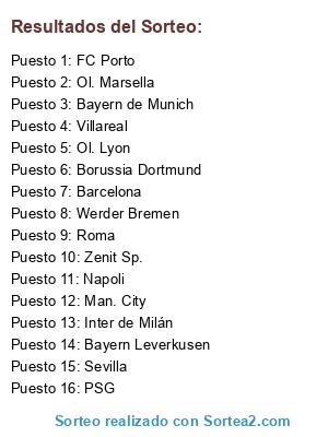 Lista de participantes: Inter de Milán, Sevilla, Villareal, Bayern de Munich, Napoli, Barcelona, PSG, FC Porto, Roma, Borussia Dortmund, Ol. Marsella, Ol. Lyon, Zenit Sp., Bayern Leverkusen, Man. City, Werder Bremen.