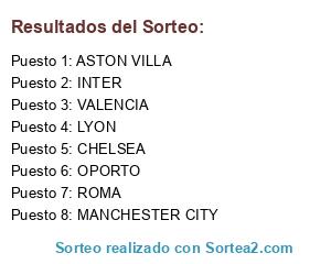 Lista de participantes: OPORTO, CHELSEA, ASTON VILLA, ROMA, INTER, VALENCIA, LYON, MANCHESTER CITY.