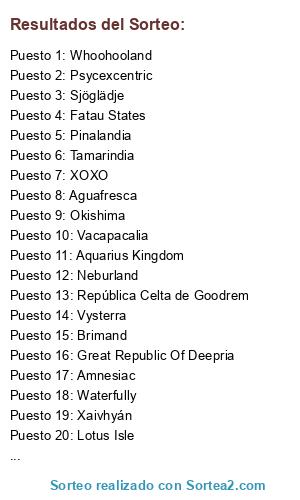 Lista de participantes: Aguafresca, Amnesiac, Aquarius Kingdom, Azuis, Brimand, Fatau States, Great Republic Of Deepria, Lotus Isle, Neburland, Okishima, Pinalandia, Psycexcentric, Reino de Lindblum, República Celta de Goodrem, Sjöglädje, Tamarindia, Vacapacalia, Vysterra, Waterfully, Whoohooland, Xaivhyán, XOXO.