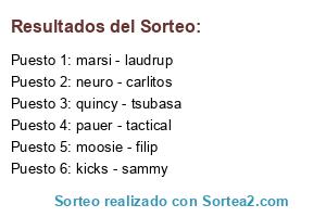 Lista de participantes: neuro - carlitos, pauer - tactical, quincy - tsubasa, weevil - tano, kicks - sammy, marsi - laudrup, moosie - filip.