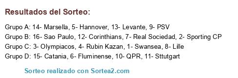 Lista de participantes: 1- Swansea, 2- Sporting CP, 3- Olympiacos, 4- Rubin Kazan, 5- Hannover, 6- Fluminense, 7- Real Sociedad, 8- Lille, 9- PSV, 10- QPR, 11- Sttutgart, 12- Corinthians, 13- Levante, 14- Marsella, 15- Catania, 16- Sao Paulo.