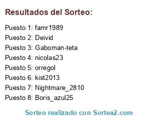 Lista de participantes: kist2013, Gaboman-teta, famr1989, Deivid, orregol, Nightmare_2810, Boris_azul25, nicolas23.