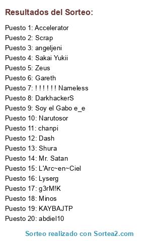 Lista de participantes: abdiel10 , Dash , L'Arc~en~Ciel , Soy el Gabo e_e , KAYBAJTP , ! ! ! ! ! ! Nameless , g3rM!K , chanpi, Mr. Satan , Sakai Yukii , Shura , Lyserg , Minos , DarkhackerS , Scrap , Zeus , Narutosor , angeljeni , Accelerator, Gareth.